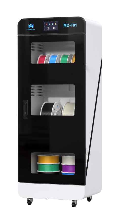 MINGDA MD-F01 is an intelligent filament storage and automatic feeding cabinet that maintains optimal temperature and low humidity for up to 6 large spools, supports 1.75 mm technical filaments with RFID and automatic change features, and ensures uninterrupted, high-quality 3D printing for large industrial builds.